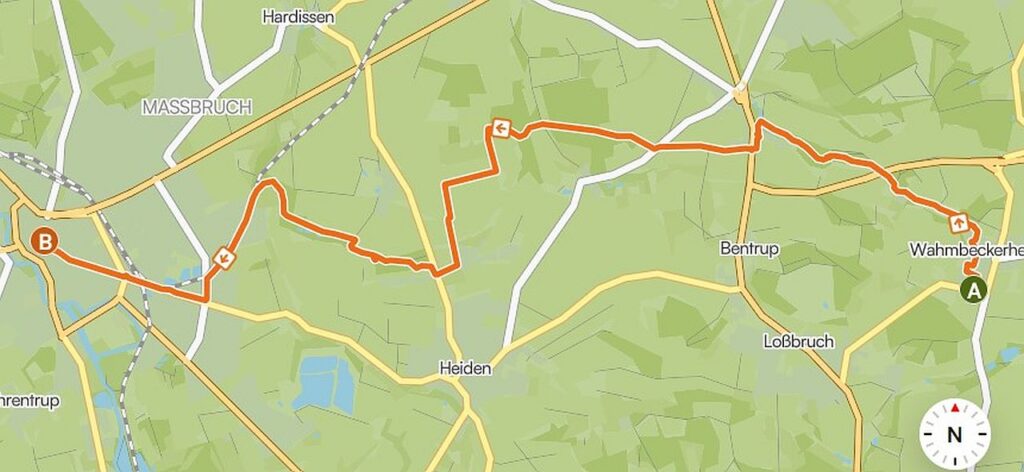 Von Lossbruch über Wahmbeck und Hessloh nach Lage. Das Höhenprofil weist einen kontinuierlichen und sanften Abstieg von 240m am höchsten auf rund 110m am tiefsten Punkt aus. Track der Tour bei Komoot.